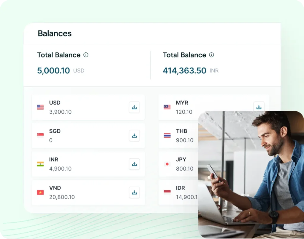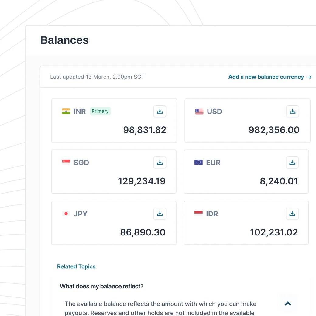 Once funds are collected into your Global Collection Account, they appear in your WonderCapitalg dashboard under your available balances. You can then choose to hold the balance, convert it to another supported currency, make payouts to your vendors or partners, or withdraw to your bank account as per your business needs.